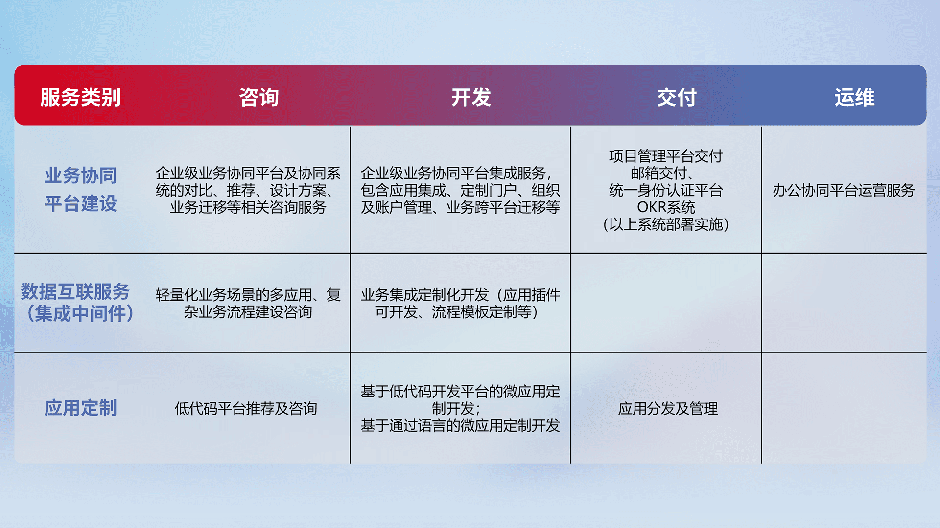 针对钉钉、、、、企微、、、IDaas等平台级产品提供产品的规划、、方案、、、、交付、、、定制化开发等服务,,,,实现如统一协同办公、、、、智能客户服务、、混合会议管理、、、、智能数据查询、、、等业务场景,,,实现数字化转型。。。
